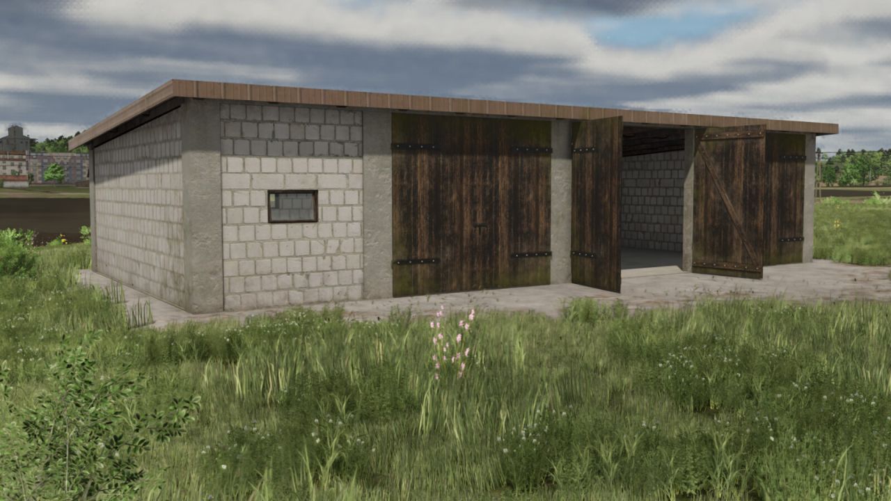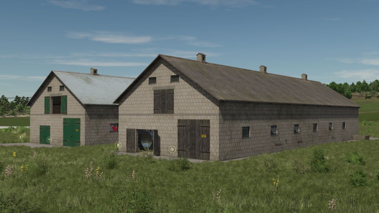The package includes two white cow barns with space for 60 cattle. The building is inspired from a real East European farm. It is equipped with complete lighting, a manually operated milking machine, an office, a separate place for the milk tank, a tool room and a high passage room.