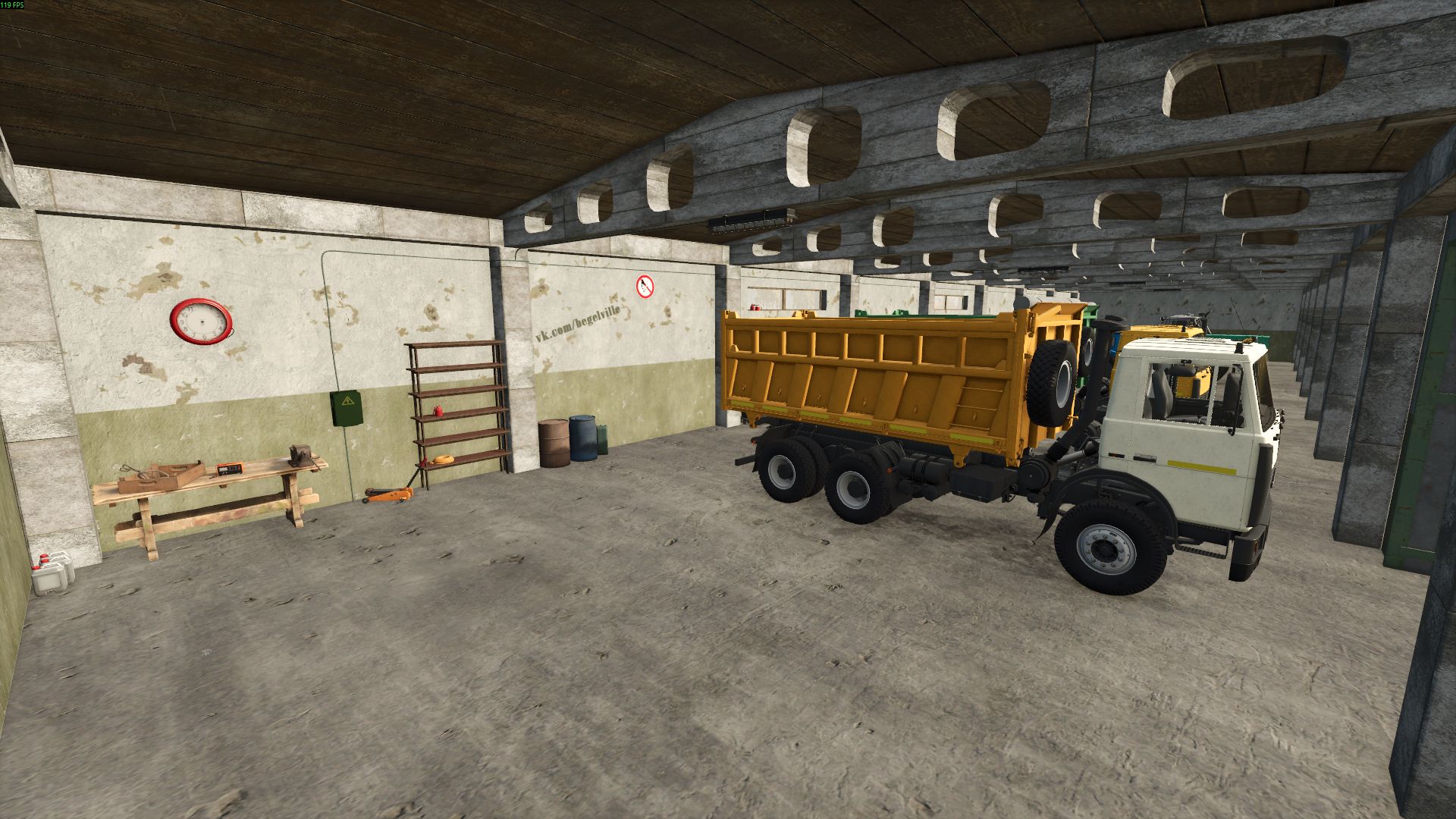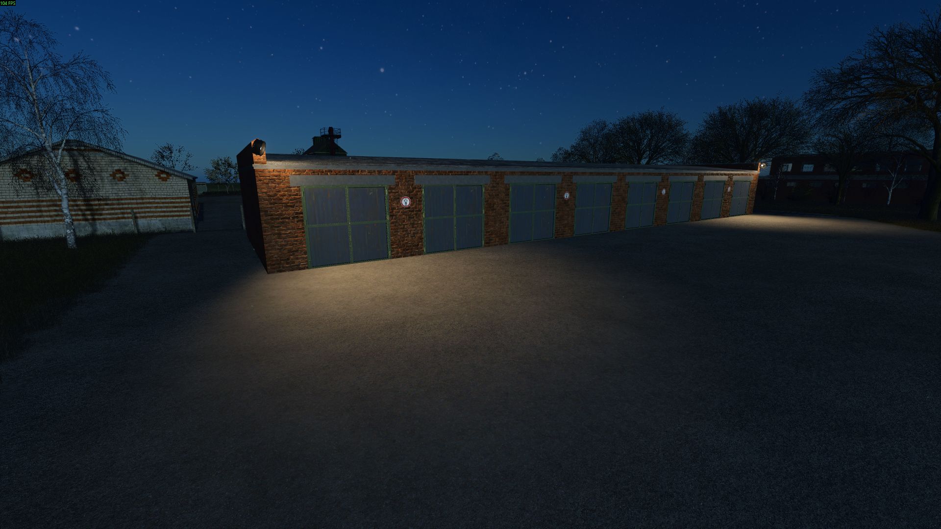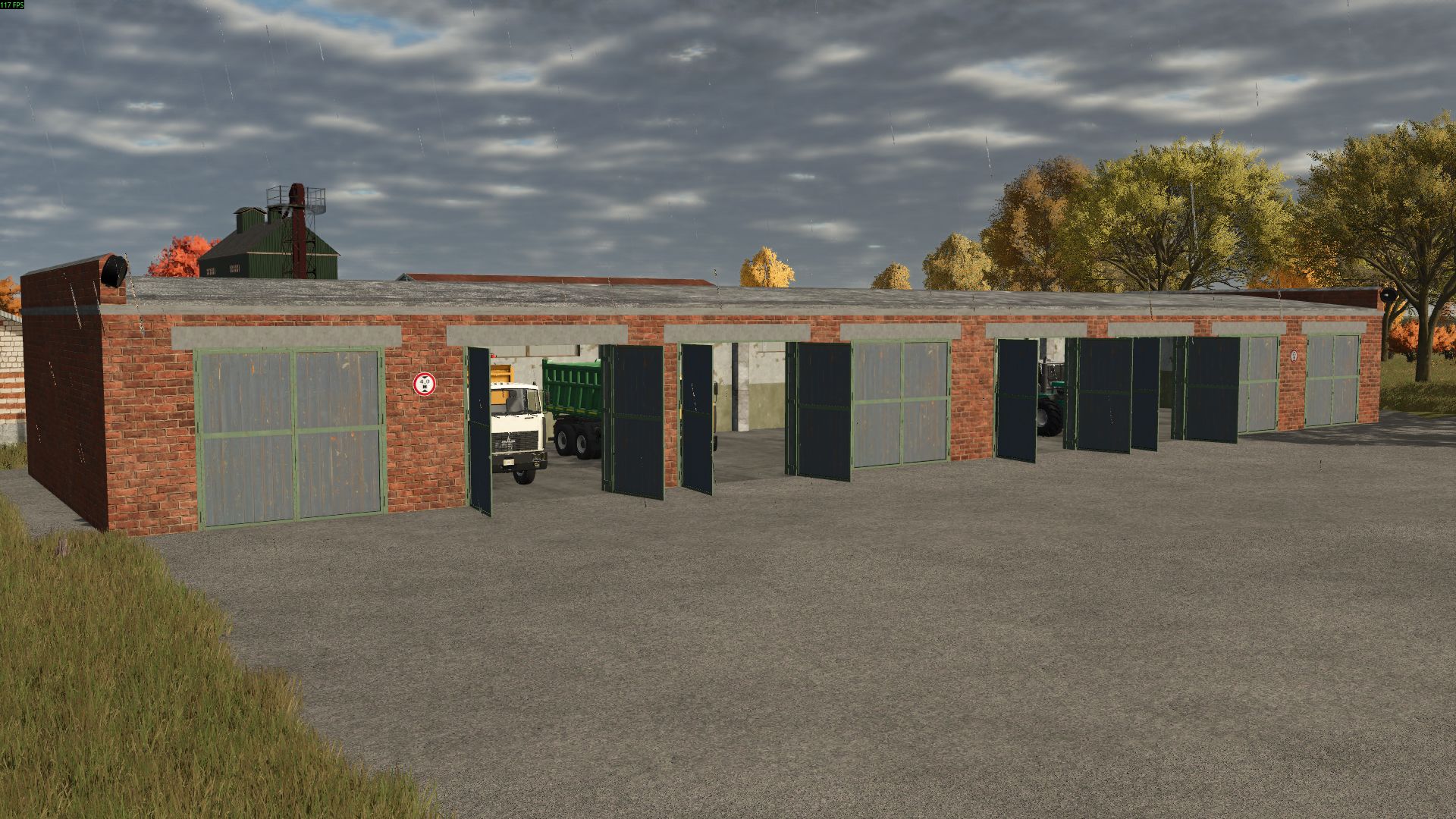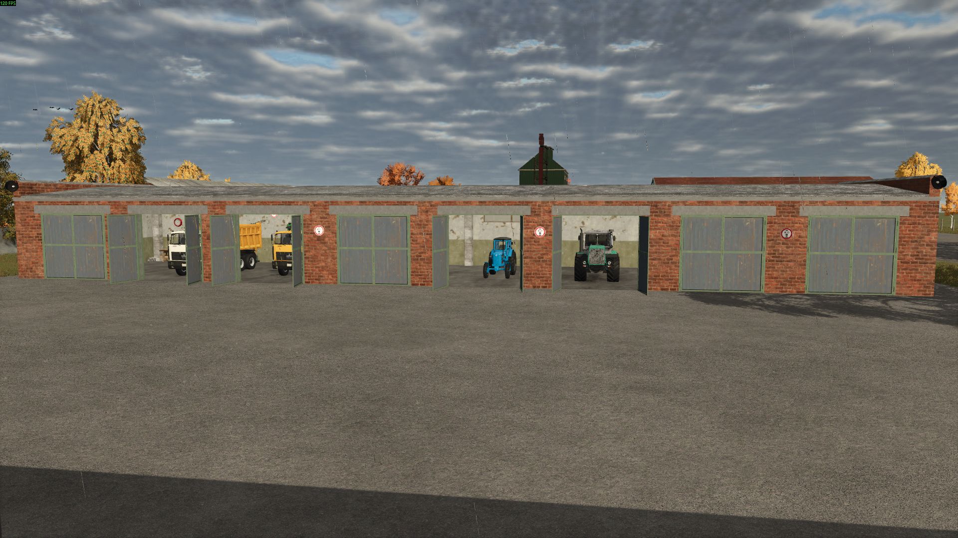 A large old-style brick garage with 8 bays, perfect for storing vehicles and equipment on your farm.