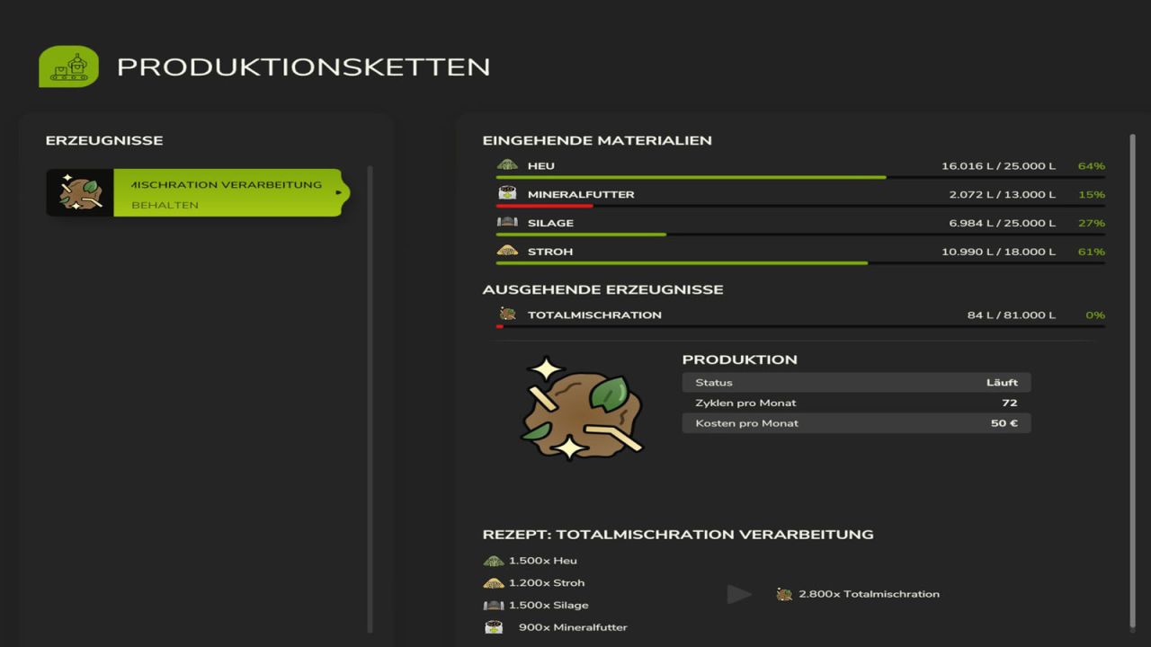 Furthermore, with the cow feed (TMR) production silage, hay, straw can also be handed over as round or cuboid bales and the mineral feed in pallet shape,