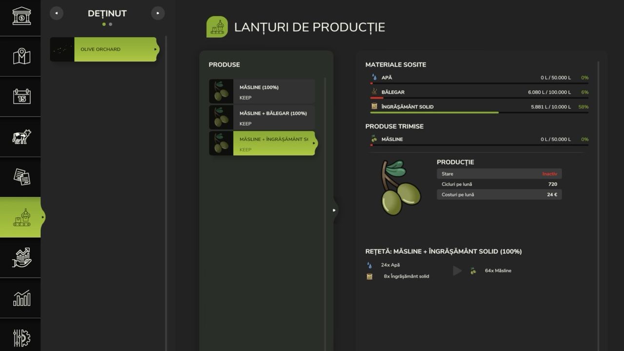 It produces olives from water, water and solid fertilizer (bulk or pallet) or water and manure.