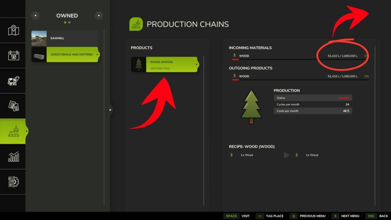 Please note that when storing, it will not be possible to generate logs or pallets — This is because the building is intended for temporary storage of wood, for later distribution or sale directly via the factory menu.