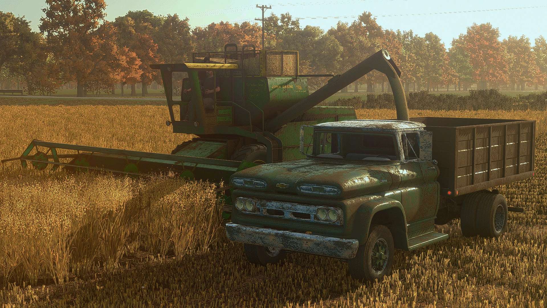 It includes a flatbed that is liftable by mouse controls.  It also includes a grain extension for it.