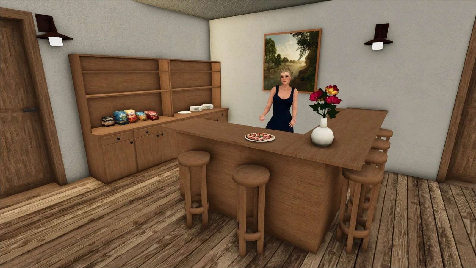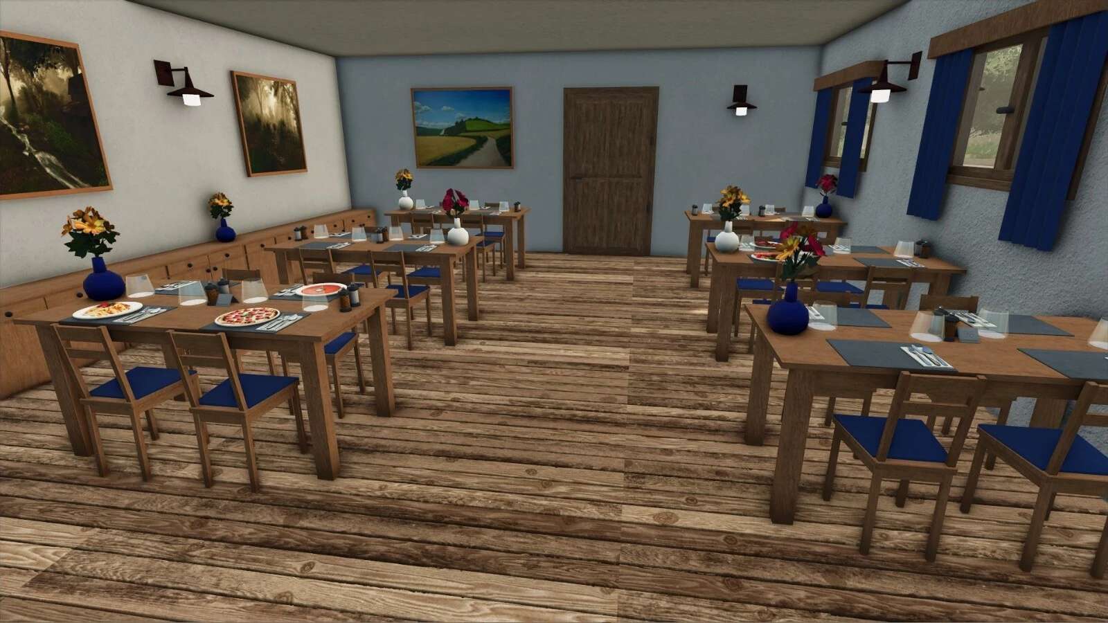 In the restaurant, a friendly waitress waits for customers and greets with “Hi” when you click near her.