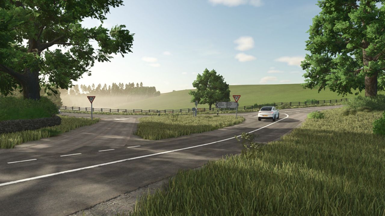 The map features typical british hilly terrain, with “layered stone walls”, lots of greenery, and right-hand traffic.