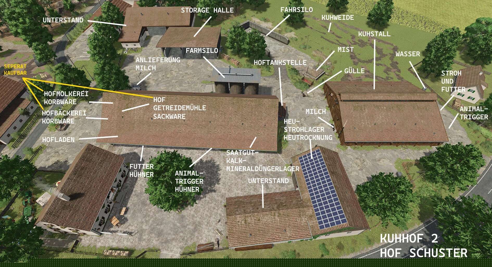 – The hay production recipe at the Schuster farm has been slightly adjusted, and there are now two unloading pipes slightly separated from each other for loading goods from the silo or production.