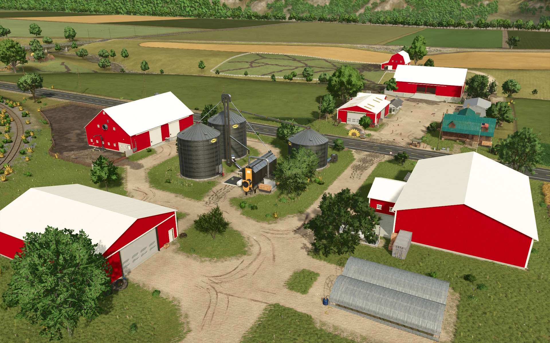 Each farm have color themed barns, animal pens and silos