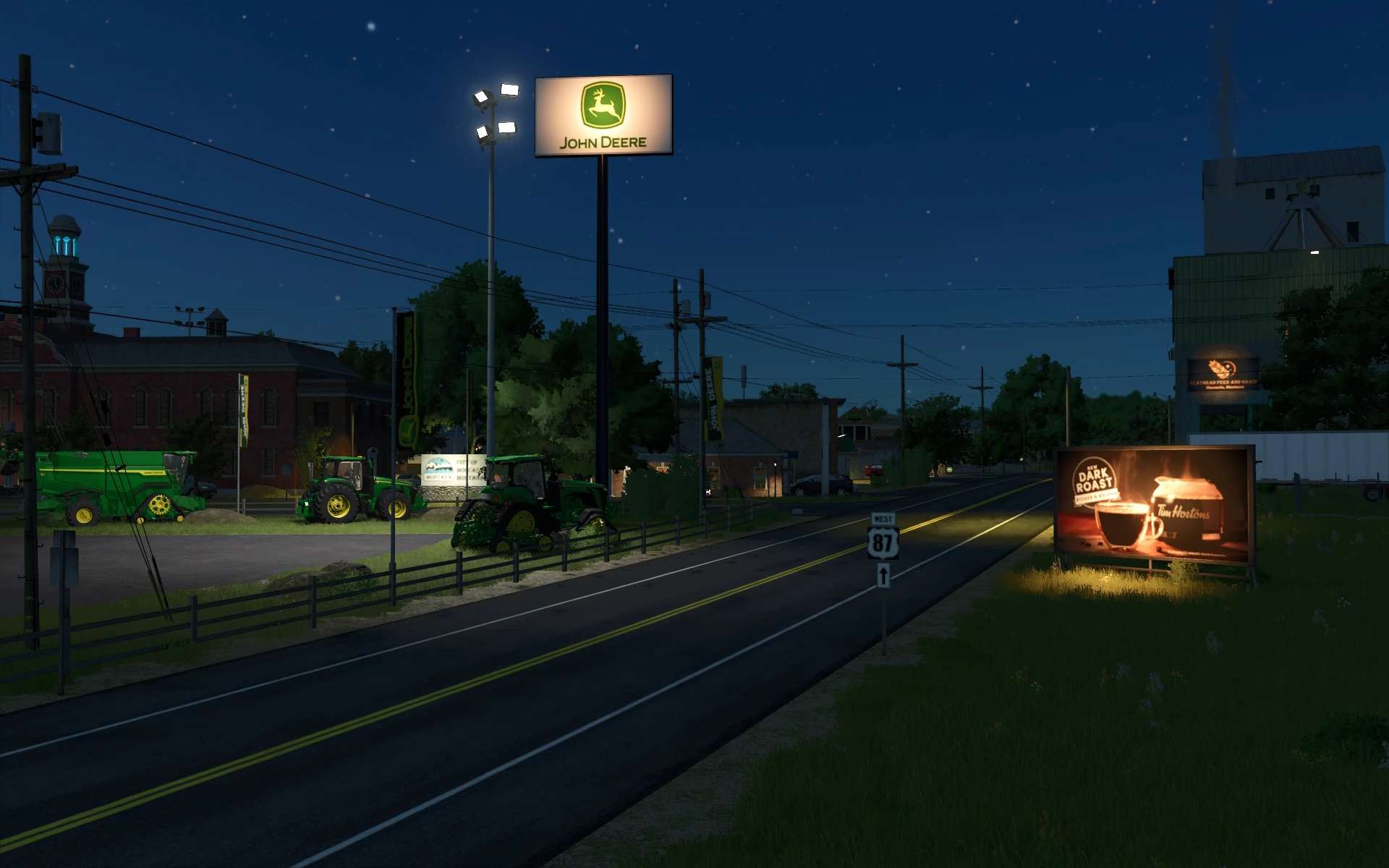 John Deere dealership with demo equipment for players to borrow.