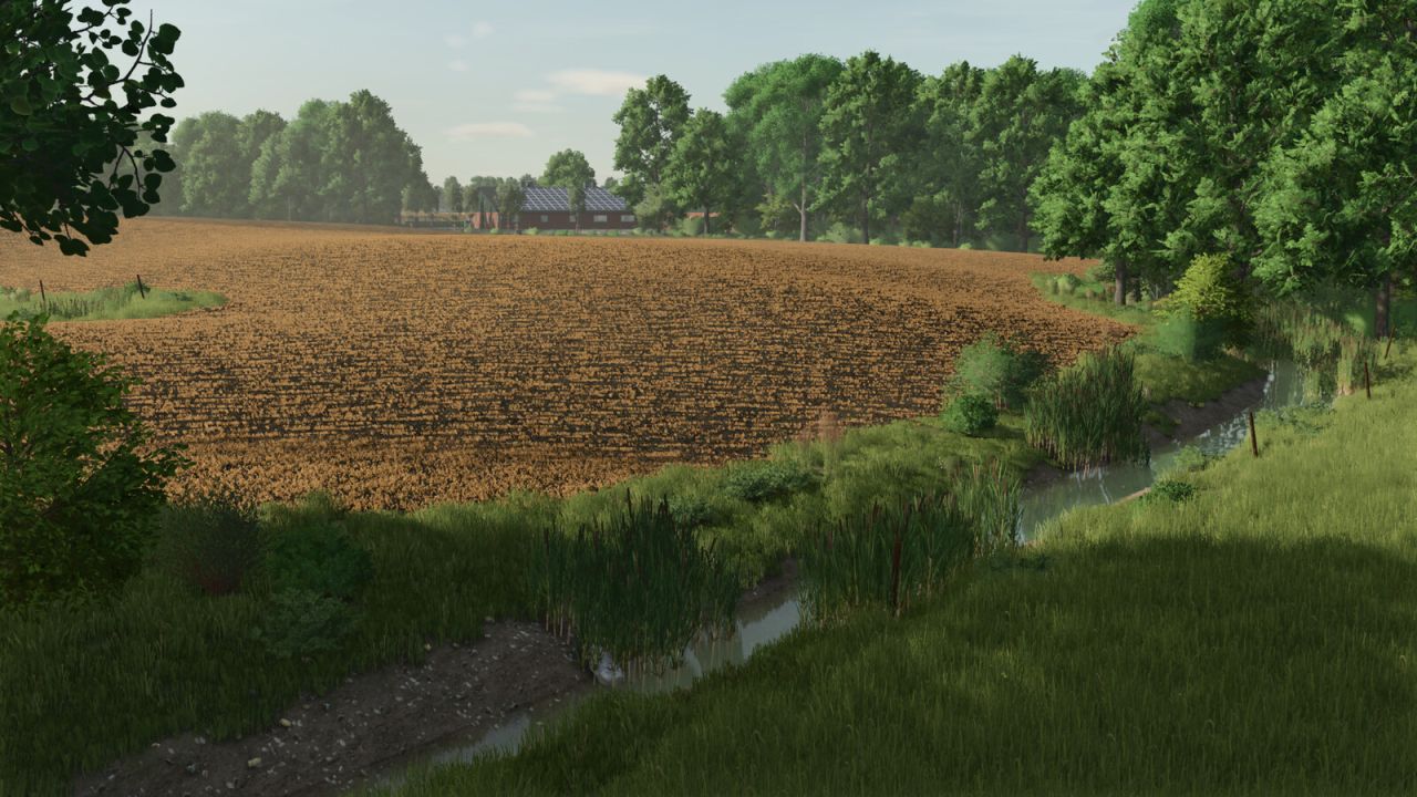 Typical landscape features such as large arable fields, grassland, forests, and small villages define the playable area.