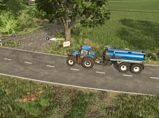 The course includes 2- and 1-lane paved roads, a field track with passing areas, production and sales points, and a BGA (commercial agricultural land use scheme). 8 farmyards. Field edge courses: Abl = Unloading Abh = Pick-up
