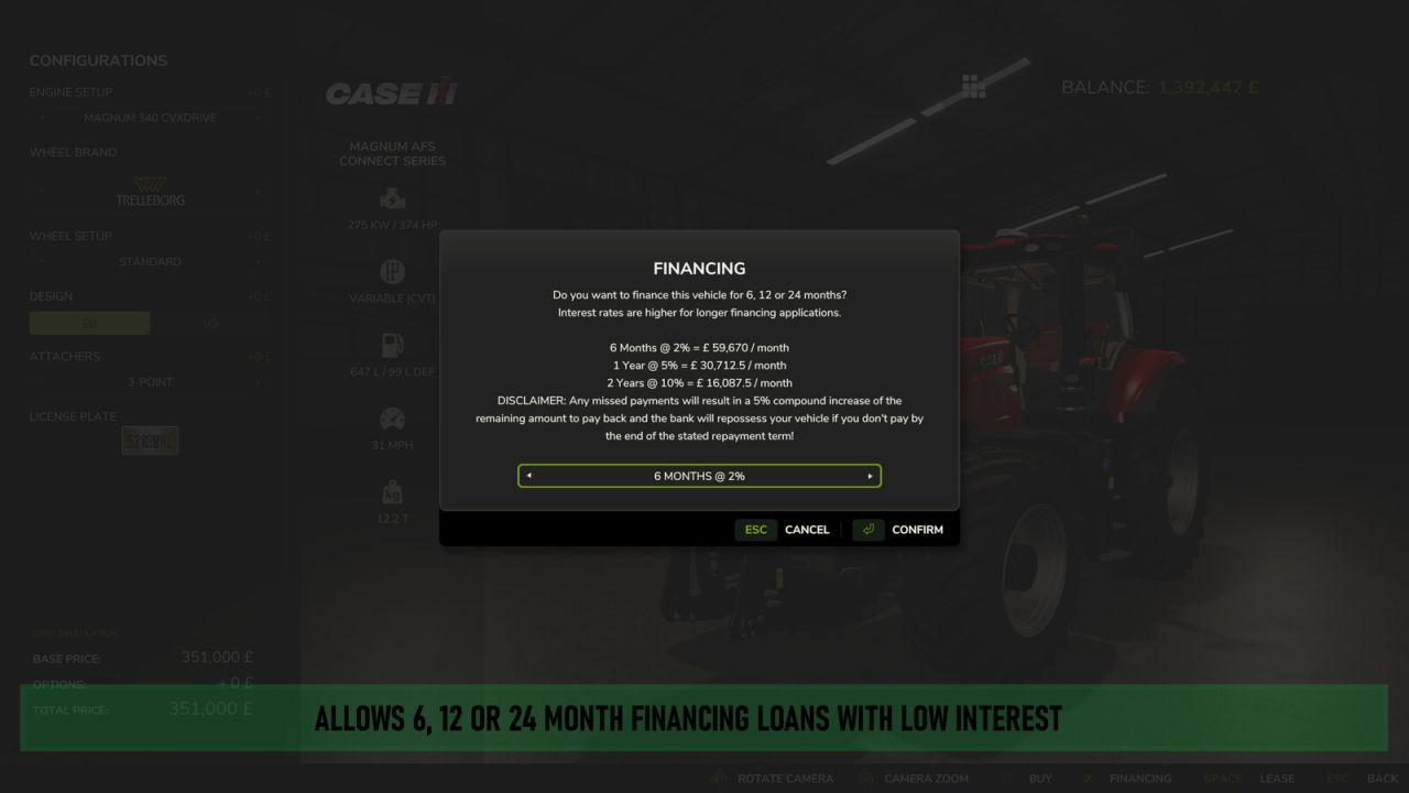 Adds the ability to pay for new vehicles using financing, allowing you to pay for new vehicles with monthly payments over either 6, 12 or 24 months, with small interest rates. Missed payments will result in additional interest, and failing to pay back the total sum by the end of the financing period will result in the vehicle being repossessed.