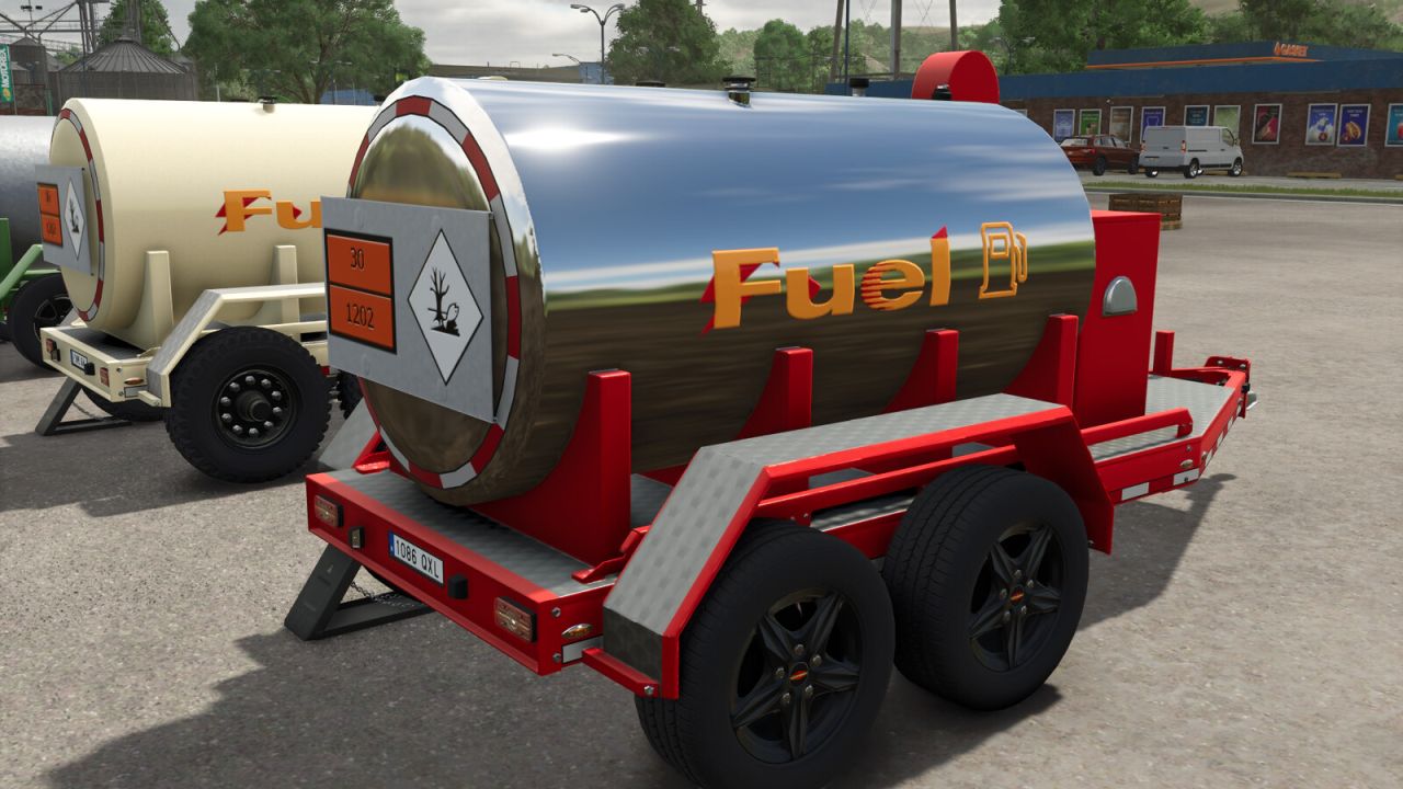 Fuel Tank trailer with Box and Fire Extinguisher. With this tank you can buy fuel to fill the machinery in the fields.