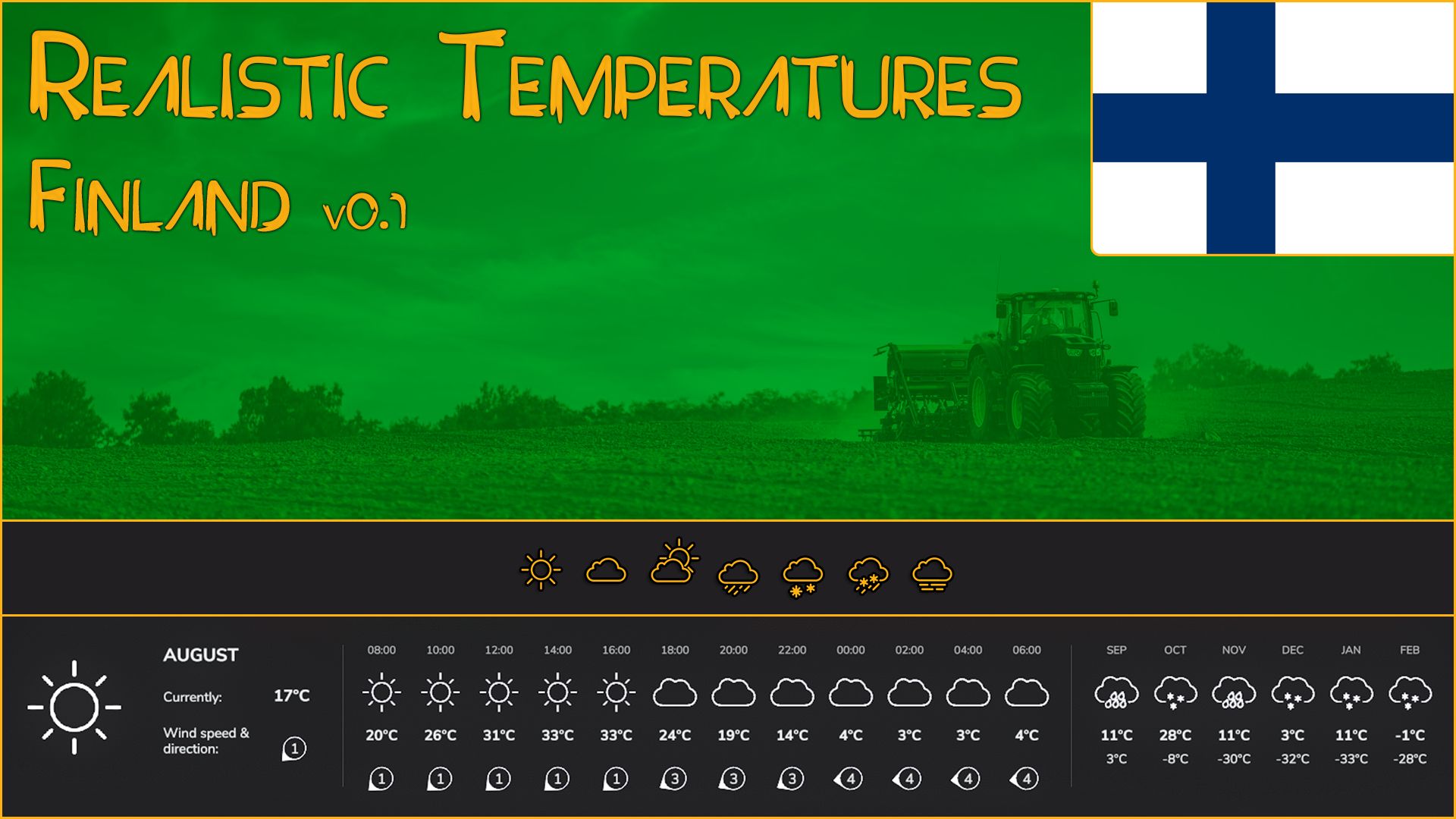 I bring you Realistic Temperatures – Finland, the nineteenth of a series of scripts for FS25 that will allow for more realistic and varied temperatures depending on the region you are playing. This mod also allows for rain/snow/hail to happen in more seasons, region dependent.