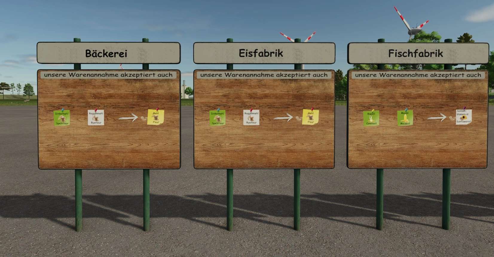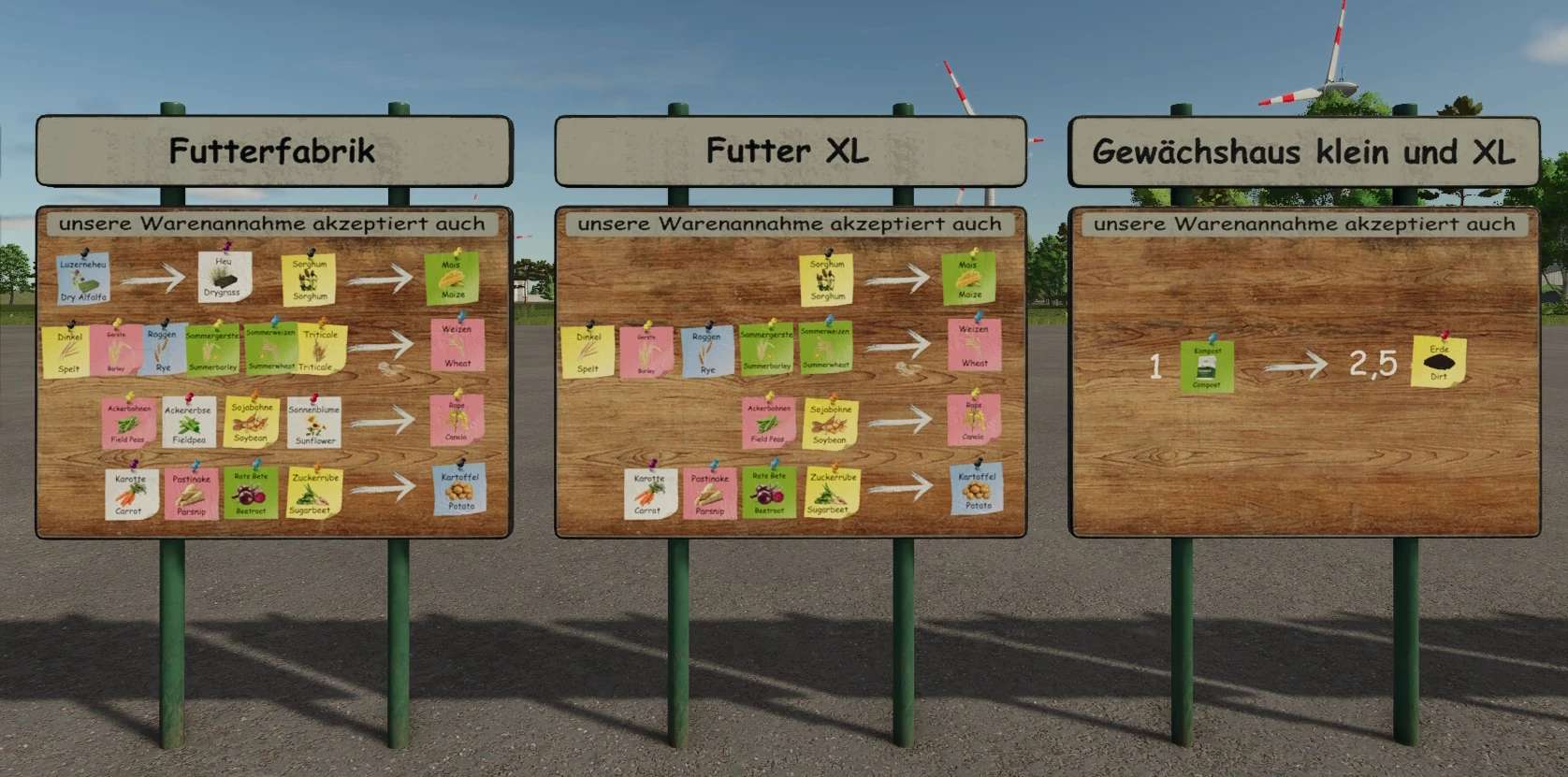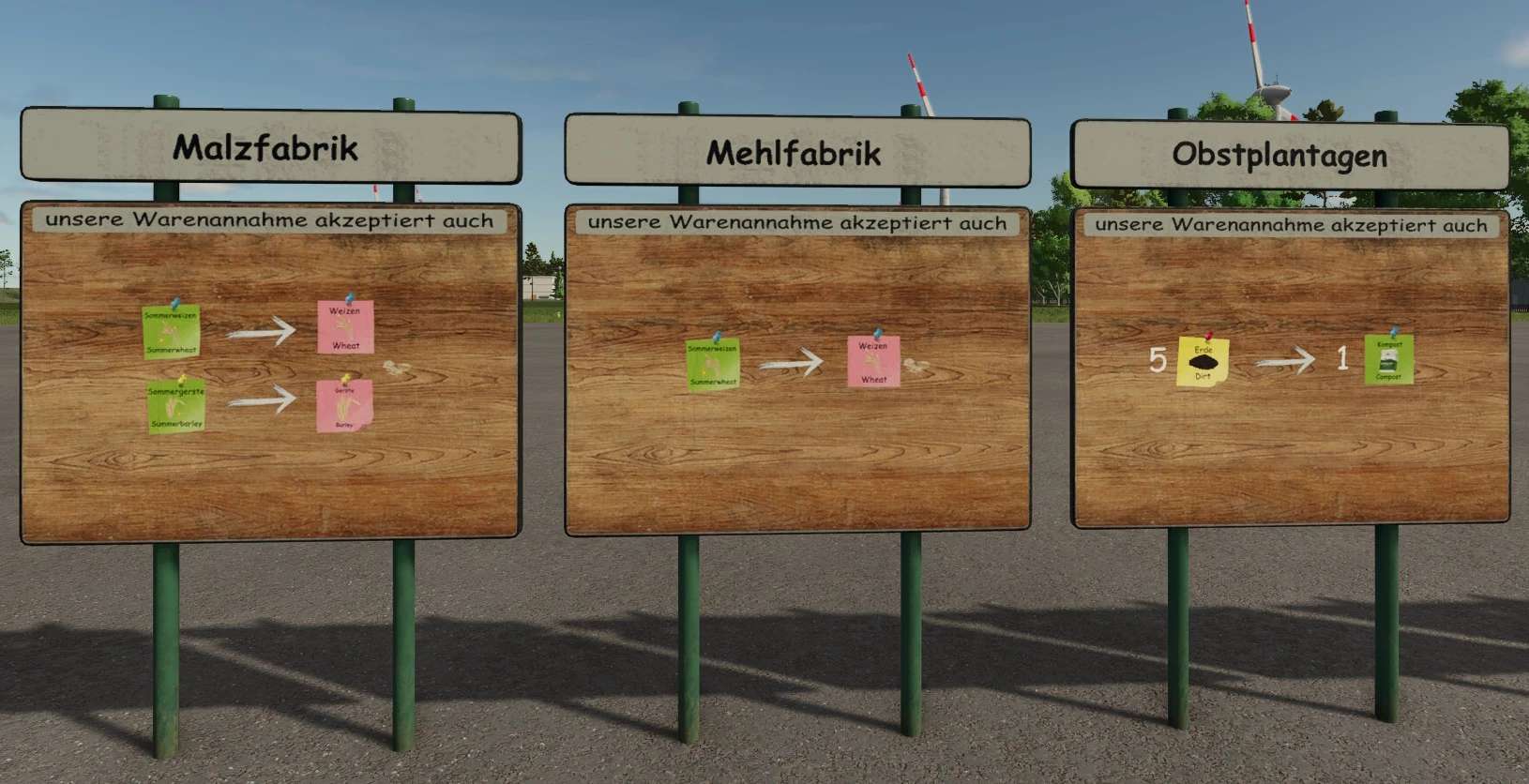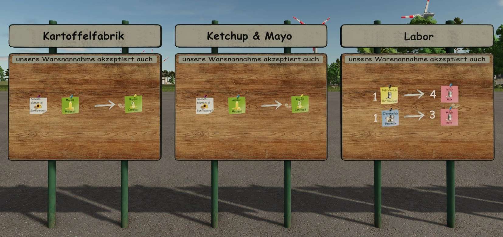 Signs that visually explain the installed converters. The signs are located in the construction menu under Decorations and have a design selection that determines which production the converter is displayed for.