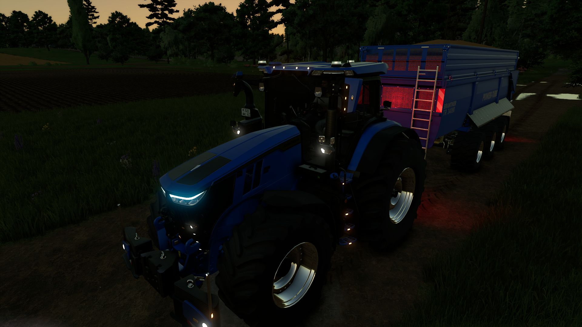 Choice of interior color, wide tires to choose from Changed engine sound and also braking sound, black smoke from the exhaust pipe, colors of the tractor and wheels, flashing lights to choose from, side lights Front bumper with added weight, engine configuration stickers changed, added power to the 7R 370 and 7R 410 engine Tinted windows, changed backlight configuration, added flashing lights to the cab, registered 2 trailer Series7R_Pack, radium255 86m³, tr34090 86m³, 126m³ the trailer tonnage and capacity have changed, the unloading speed has become faster, the backlight configuration has changed. Side lights, daytime running lights, markers, turn signals, flashing lights, curtains for the rear bumper of trailers, any color of your choice and rims.